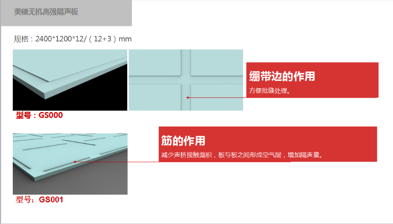美穗隔聲板專利產(chǎn)品獨(dú)有兩項(xiàng)獨(dú)特設(shè)計(jì):(一)繃帶邊讓批縫處理變的簡單,由于補(bǔ)縫材料與隔聲板基材一致,完成后不會(huì)出現(xiàn)開裂現(xiàn)象,保證了裝飾效果;(二)板面設(shè)計(jì)3mm凸起的隔聲筋,兩種型號(hào)的產(chǎn)品結(jié)合使用的時(shí)候,兩者之間由于隔聲筋的作用,接觸面積減少并且形成空氣層,進(jìn)而大大提升了隔墻系統(tǒng)的隔聲量。